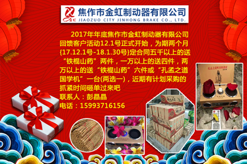 2017年年底焦作市金虹制動器有限公司 回饋客戶活動12.1號正式開始為期兩{17.12.1號-18.1.30號}定合同五千以上的送“鐵棍山藥”兩件,一萬以上的送四件,兩萬以上的送“鐵棍山藥”六件或“孔孟之道國學(xué)機(jī)”一臺(兩選一),近期有計劃采購的抓緊時間砸單過來吧!